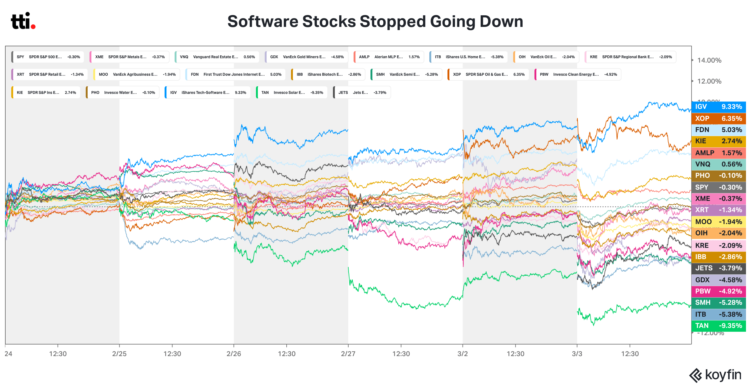 A couple weeks ago I wrote that if you wanted to know where Bitcoin was headed.. look at Software (IGV). They've been joined at the hip. Highly correlated. And at the time, both were getting destroyed. Well.. since the Citrini AI article dropped on February 22nd, Software is now the leading industry group in the market. Not semis. Not energy. Software. And it's not random. IGV is bouncing off the exact same support level that held during the Trump tariff panic in April 2025. The same level...
