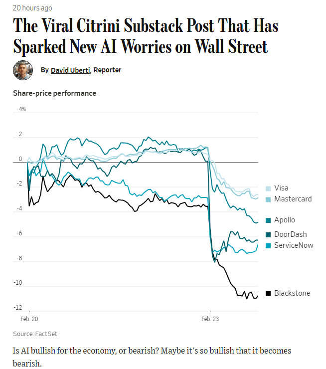 Price moves first. The story comes second. That is the single most important thing I can teach you about markets. Yesterday Citrini Research published a piece called "The 2028 Global Intelligence Crisis." It's a thought experiment. What happens when AI replaces enough high income jobs that consumer spending collapses? Consumer spending is 70% of US GDP. If those people stop earning, they stop spending. And if they stop spending, it doesn't matter how productive the machines are. The money...