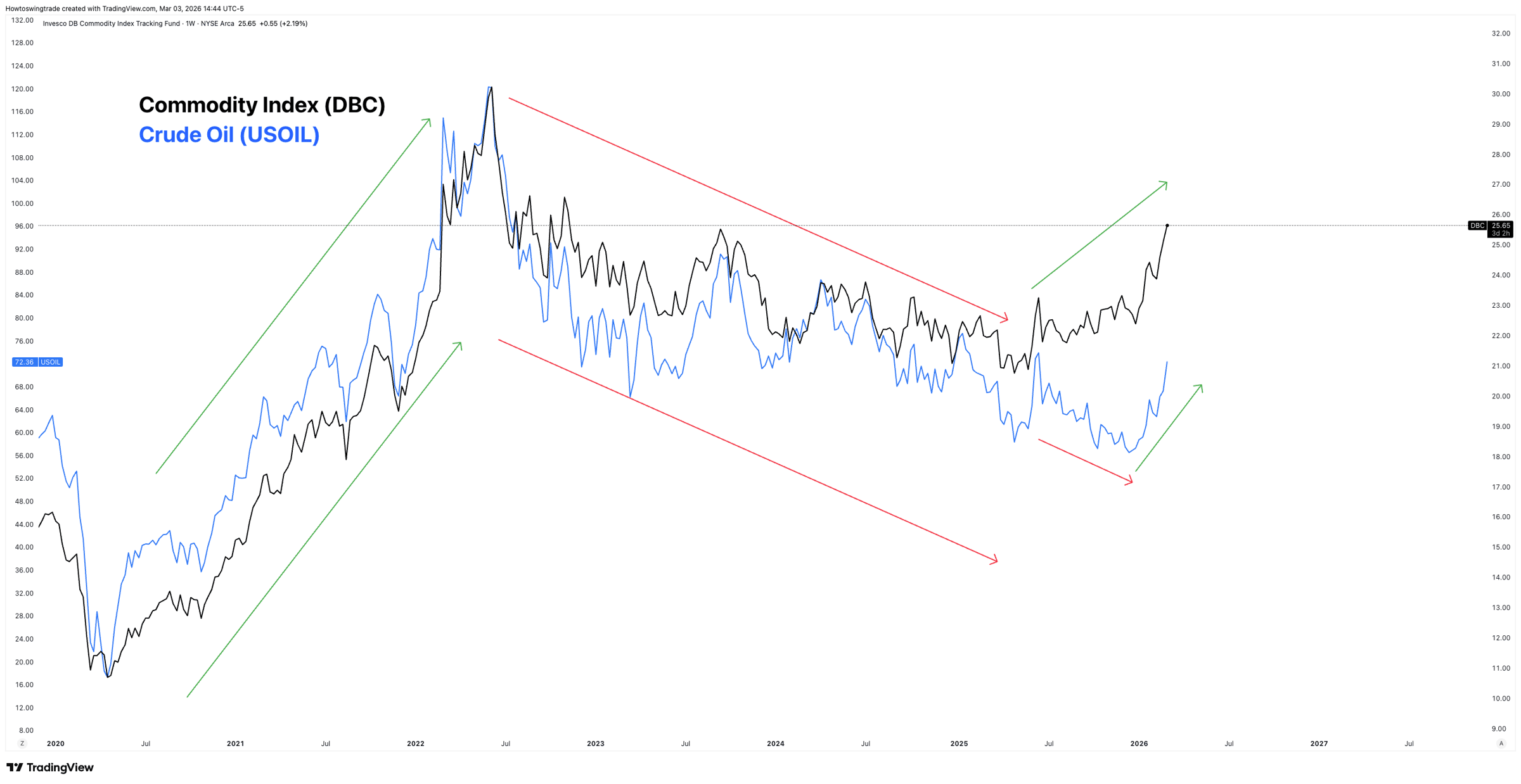 The Commodity Index Fund (DBC) is breaking out to levels not seen since November 2022. Nobody is talking about it. DBC doesn't trend on X. It doesn't get a CNBC segment. It's not sexy enough to make the headlines. But it's one of the single most important charts in the market right now. DBC tracks a broad basket of commodities.. energy, metals, agriculture. When this index breaks to multi year highs, it's telling you something about the entire commodity complex that no individual asset can....