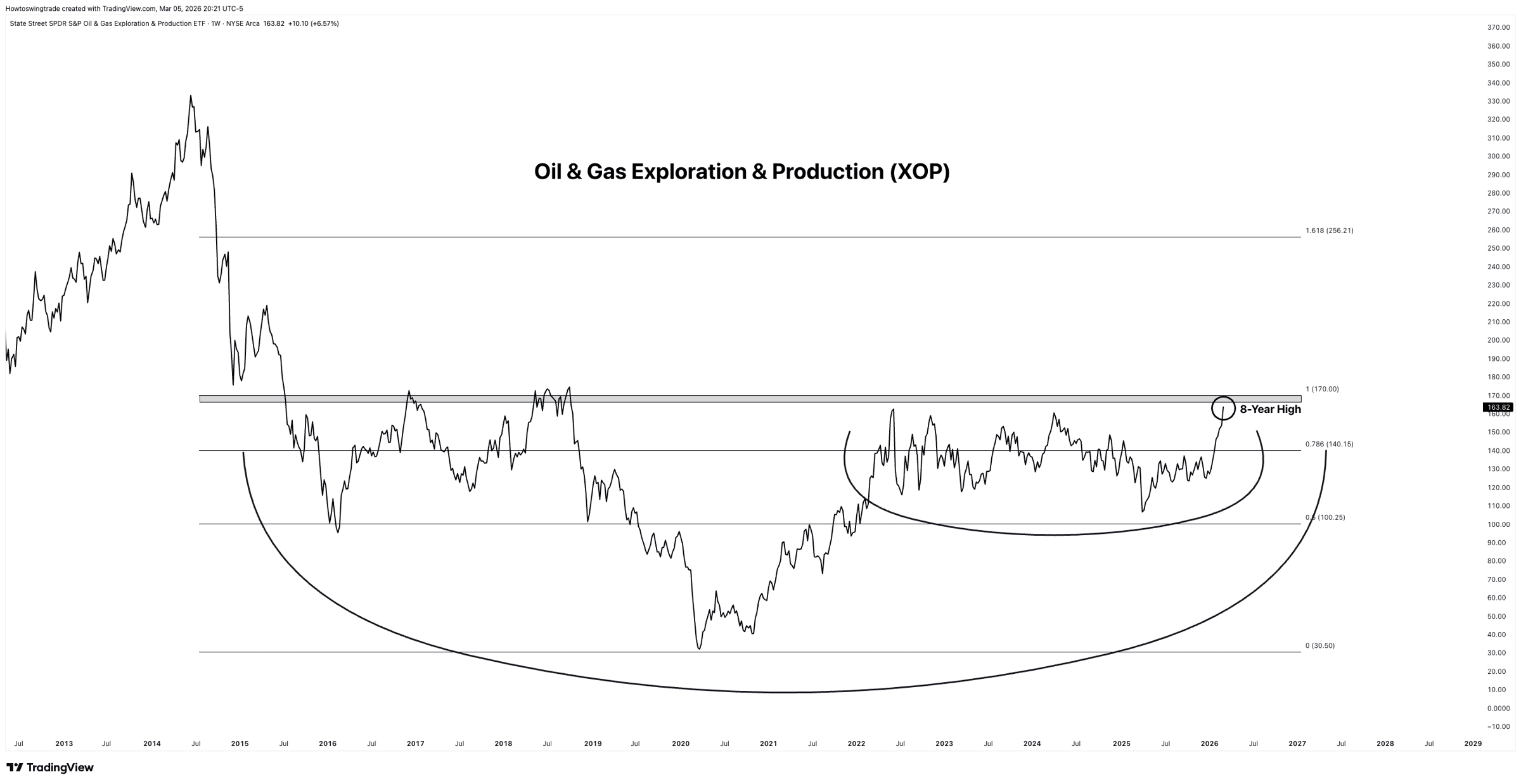 No newsletter this morning. Life got in the way. It happens. But we've been talking about a chart all day inside of TTI that I need to share with you before tomorrow's open. XOP. The Oil & Gas Exploration & Production ETF. Oil & Gas Exploration & Production, XOP, Weekly Look at that base. XOP has been building a cup and handle pattern since 2014. Twelve years. The neckline sits at $170. Price closed today at an 8 year high - pressing directly into the breakout level. If you're not familiar...