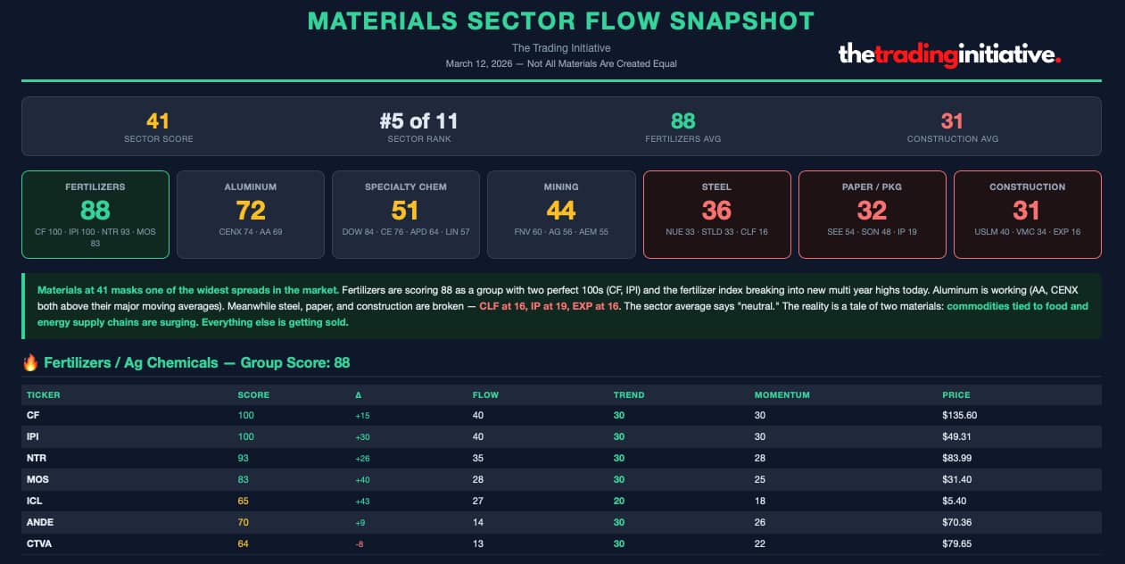 The Fertilizer Index broke out to multi-year highs today. Not AI. Not semiconductors. Fertilizer. The stuff that literally comes out of the ground. We covered this last week during the Execution Report webinar. The setup was all over the data. And today we sold a double in DOW.. a specialty chemicals name scoring 84 in our Flow Score with perfect trend and momentum readings. A double. 100%. In 4 weeks. In a chemicals stock. While most people are staring at tech and throwing cash at Polymarket hoping for rate cuts. Materials has a Flow Score of 41. That sounds average. It's not. Because inside that 41 is one of the widest spreads in the entire market right now. Fertilizers are scoring 88 as a group. CF and IPI both have perfect 100s.. the highest scores in our entire universe. NTR at 93. MOS at 83. Four names above 83 in the same industry. The last time we saw this was in energy stocks right before the conflict with Iran began.. it's not common. Aluminum is working too. AA and CENX both above their major moving averages with full trend support. Meanwhile steel is at 36. Construction at 31. CLF at 16. EXP at 16. Same sector. Completely different stories. The reason fertilizers are ripping isn't complicated. The Strait of Hormuz disruption is repricing the entire supply chain. 50% of global urea and sulfur exports transit through that strait. CF is up 55% year to date. This isn't just widespread speculation.. it's supply chain math. And here's the bigger picture. Energy leading. Materials running. Commodities breaking out. This is later stage bull market behavior. This is when capital rotates out of growth and into real assets.. the stuff the global economy actually needs to function. It tends to accelerate once it starts. The Flow Score had us positioned in these names before any of this was a headline. No predictions. No macro calls. Just following where institutional capital was going.. and it was going into the ugliest, most boring corner of the market. Today that paid us a double. Tech stocks are cool. Literal shit stocks are paying. Our weekly Flow Reports break down where institutional capital is flowing across all 11 sectors. If you want to see what the Flow Score is pointing at right now inside of Materials and commodities, grab a free copy here: Profits Over Prophets, Hamilton Every week we publish the Flow Report.. a proprietary system that tracks where institutional capital is moving across the entire market. No predictions. No narratives. Just data. If you want the full picture and access to the trades we are making because of it.. learn more about the Market Blueprint here. |
