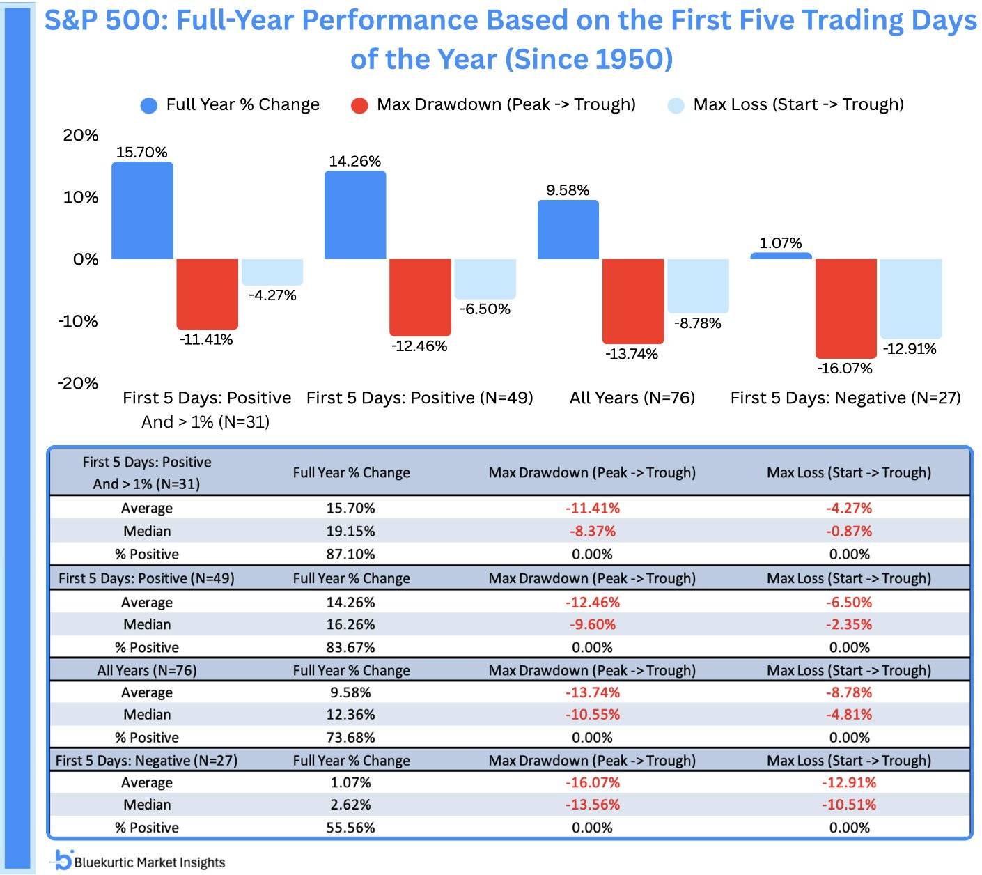 Momentum is a powerful tool in the markets. Think it like as gasoline for the market.. you aren't going to get far on an empty tank. So when we look at seasonality data that suggests momentum is picking up, it's worth paying attention to. And today a very powerful seasonal indicator just fired off: the first five trading sessions of January ended green. The Early Sessions MatterThe first five trading sessions of the year matter because they indicate where institutional demand is headed. By the time January comes around, institutional portfolios are reset, cash has been allocated and positioning tends to reflect intent rather than cleanup (hello tax loss harvesting). When the market is higher after the first give days, it signals early institutional demand. Large allocators.. you know, the big guys who control the direction of the market.. don't chase strength blindly. They scale in when they expect a theme, narrative or trend to persist for the longer term. The early bid we're seeing tends to show up as momentum.. and it lasts. Here's where we stand as of the close today: All four major US market indexes are solidly in the green, lead higher by the Russell 2000 up over 4% to start the year. Historically, this bodes well for the coming year. History Tends To RepeatI'm in the camp that previous performance does indicate the potential for future profits. That's how trends work. If we find something trending higher, it's more profitable to assume that trend will continue until the weight of the evidence suggests otherwise. And when we look at the first five trading sessions, the same holds true. Historically, a positive first five sessions correlate with trend continuation, stronger breadth, and fewer failed breakouts as the year develops. It doesn't guarantee upside, but it increases the odds that momentum sticks around and pullbacks are often shallow and short-lived. Here's what that data looks like from our friends over at Bluekurtic: Going back to 1950, when the first five trading days gained over 1%, the S&P 500 averages 15.7% over the course of the year. More impressive though is that the average max drawdown throughout the year is only 11.4%. The corrections are shallower and generally bought up. That's a strong track record to bet against this year. Everybody Expects WeaknessIt's a midterm year. Everyone expects this year to be weaker than the rest. And maybe they're right. But oftentimes people take it to the extreme. They expect a weak year to translate into a.. bear market. It's probably not going to happen. The first five trading sessions is a read on participation and risk appetite from the largest banks, financial institutions and money managers in the world. When they show up and buy stocks early, momentum has something to build on through the course of the year. I wouldn't be so sure about this crippling midterm year if I were you.. Especially while primary trends are still up. We're holding our Academy Live session tomorrow morning where we'll be covering everything there is to know about entering and exiting trades. Most traders spend 90% of the time finding the perfect entry but neglect where to exit. I think that's absolutely backwards.. and I'm going to talk about it with the community tomorrow. If you want in, the info to join us for a month is here: https://docs.google.com/document/d/1IHn3NaLaV460Qi2Ju08nZLthlxTCZcnujx8R0NeBgvQ Profits Over Prophets, Hamilton PS. We've spent this week closing trades we put on six months ago in the middle of the summer. Yesterday we closed a 3,000% win on MU and today we closed a 2,000% win on GOOG. If you're wondering if you have enough time to do this.. these trades took six months to play out and required less than 30 minutes tops to execute. Hop in and I'll show you how. |